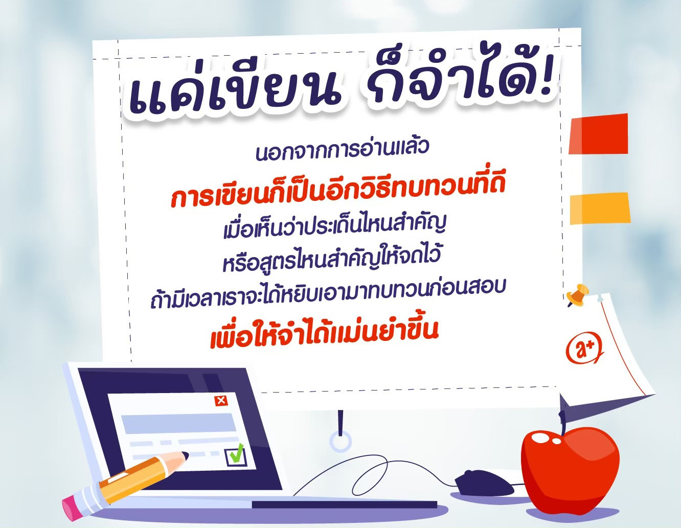 นอกจากการอ่านแล้ว การเขียนสรุปเป็นอีกหนึ่งเทคนิคสำคัญ