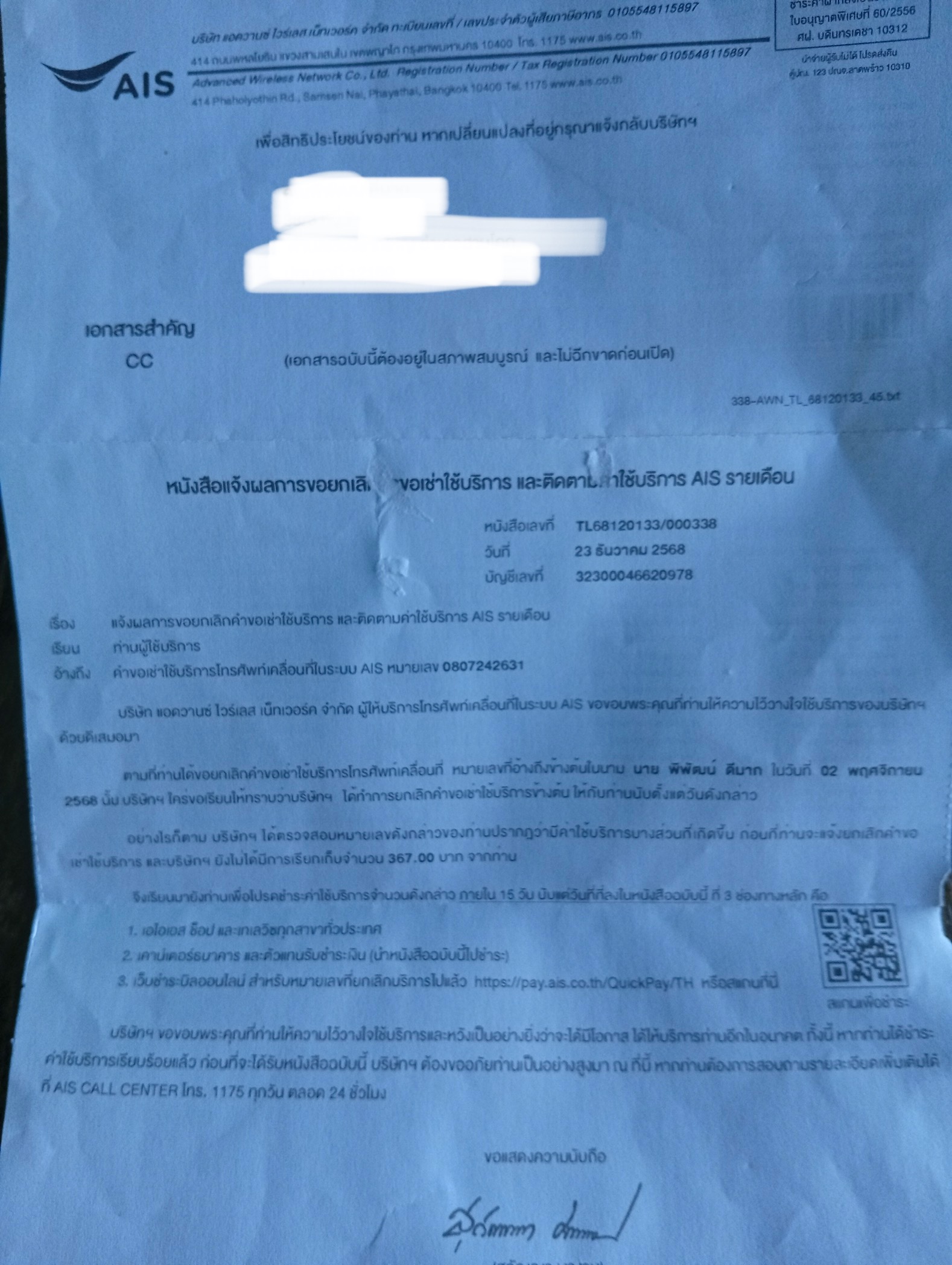 มีใบแจ้งหนี้ ais เข้ามาทั้งที่ยกเลิกไปแล้ว