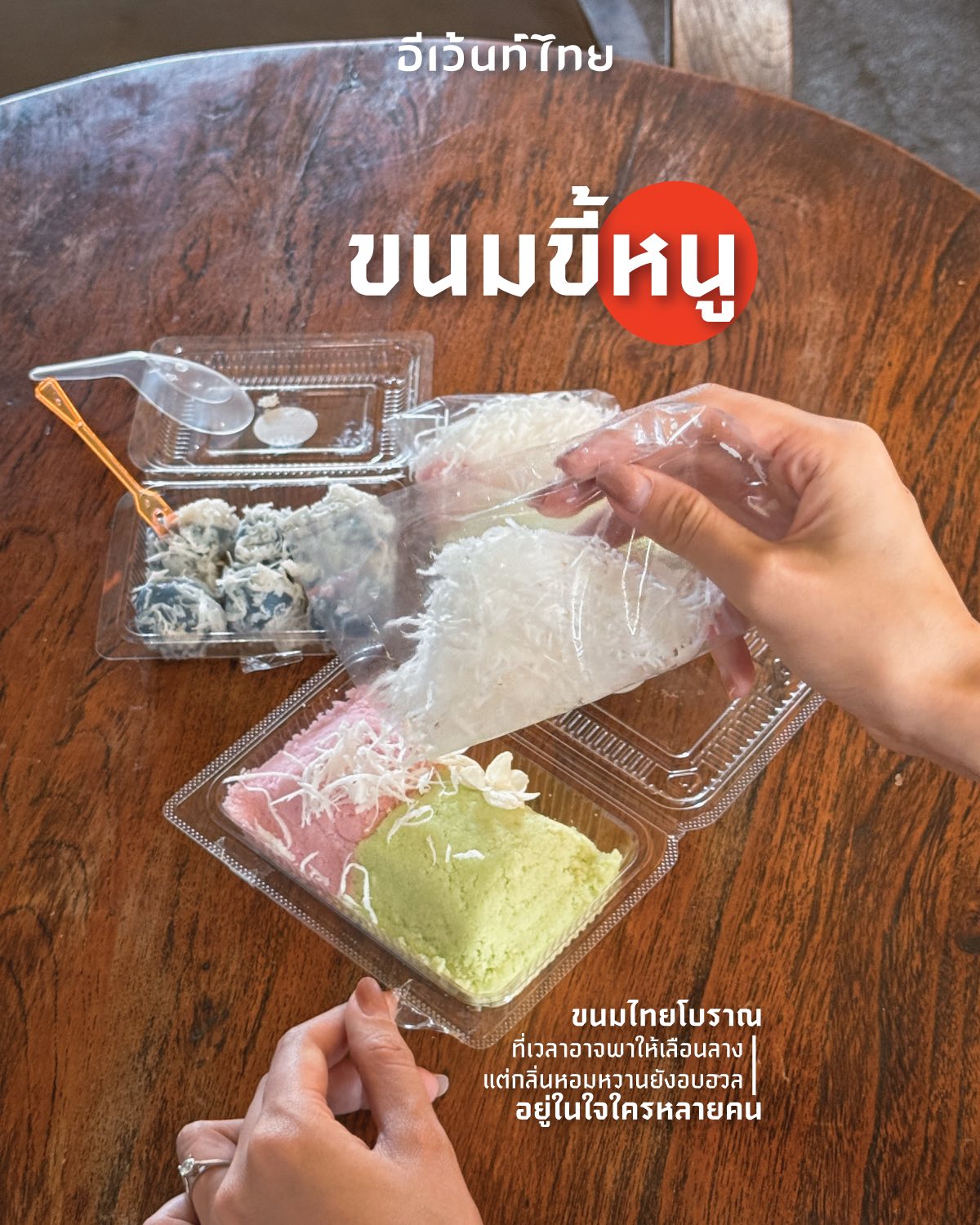 - เสน่ห์ของขนมขี้หนูไม่ได้อยู่แค่รสหวานละมุนเท่านั้น แต่ยังอยู่ที่ “วิธีกิน” ที่สืบทอดกันมา ก่อนกินนั้นจะต้อง “บีบ” หรือ “ขยำ” ก่อน อาจจะฟังดูแปลก แต่กลับทำให้อร่อยขึ้นอย่างไม่น่าเชื่อ เพราะการบีบจะช่วยให้เนื้อแน่นขึ้น กินง่าย และช่วยให้มะพร้าวขูดคายน้ำและกลิ่นออกมา เมื่อกลิ่นมะพร้าวผสมกับน้ำเชื่อมหอมดอกมะลิ กลิ่นหอมจะฟุ้งละมุนขึ้น ยิ่งถ้าใครเคยกินในเวอร์ชันห่อใบตอง ก็จะได้กลิ่นใบตองอ่อน ๆ ติดปลายจมูก ยิ่งเพิ่มเสน่ห์และรสชาติให้อร่อยขึ้นอีกขั้น