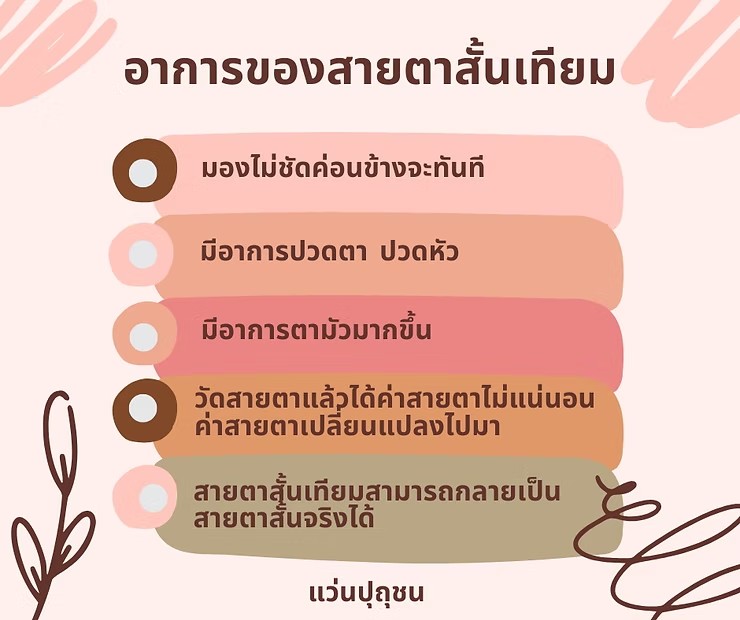 • มีอาการมองไม่ชัดค่อนข้างจะทันที แต่สายตาสั้นจริงจะค่อยๆ มองไม่ชัด