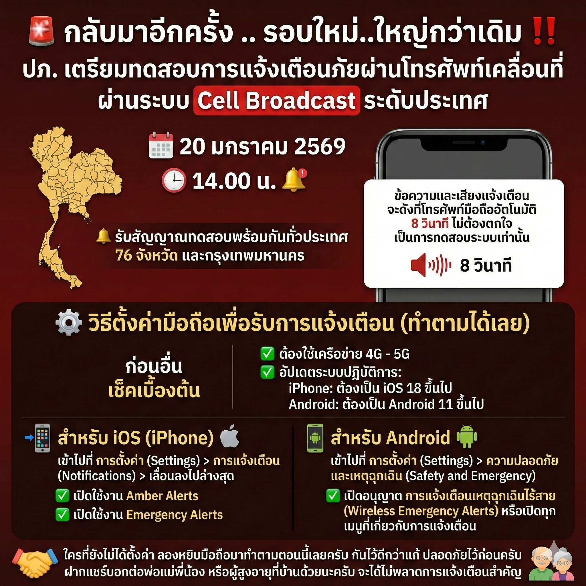 ทาง ปภ. กำลังจะมีการ "ทดสอบระบบการแจ้งเตือนภัยผ่านโทรศัพท์เคลื่อนที่" (Cell Broadcast) ระดับประเทศ รอบใหม่ที่ใหญ่กว่าเดิมครับ