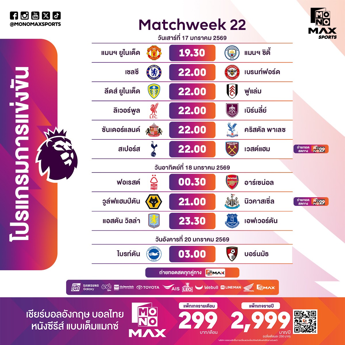 ⚽️🏴 โปรแกรม พรีเมียร์ลีก 2025/26 สัปดาห์ที่ 22 📺 #MONO29 #MONOMAX 🔴