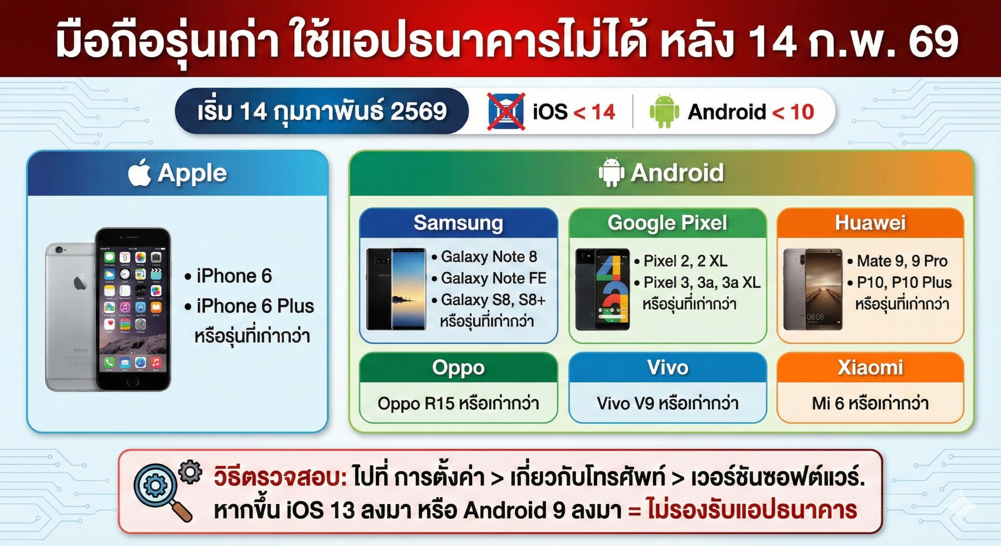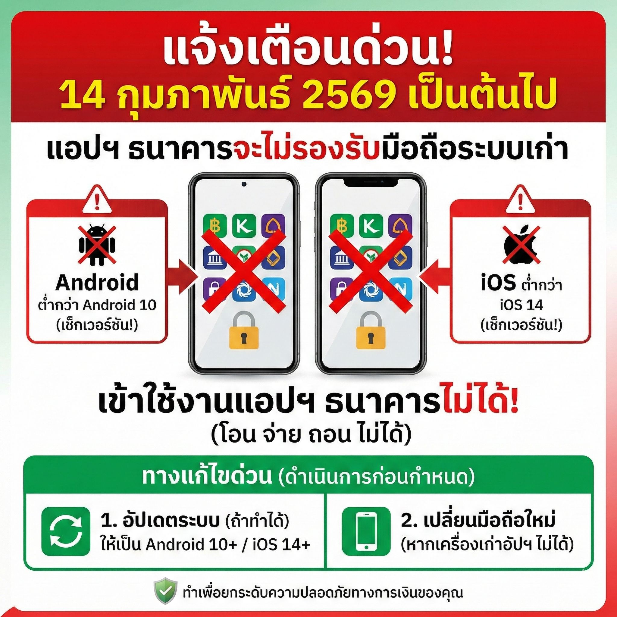เช็กด่วน! ใครใช้ Android ต่ำกว่า 10 หรือ iOS ต่ำกว่า 14 หลัง 14 ก.พ. 69 นี้ จะเข้าแอปฯ ธนาคารไม่ได้แล้วนะครับ!