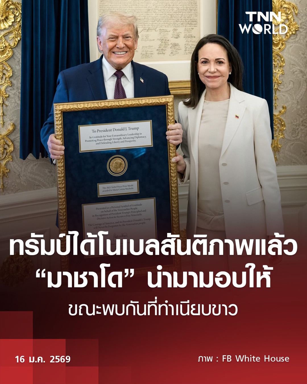 มาเรีย โครินา มาชาโด ผู้นำฝ่ายค้านเวเนซุเอลา ผู้ชนะรางวัลโนเบลสาขาสันติภาพคนล่าสุด มอบเหรียญรางวัลโนเบลพร้อมกรอบทองสวยงามให้กับประธานาธิบดีโดนัลด์ ทรัมป์ ที่ทำเนียบขาว หลังจากทั้งสองได้พบกันเป็นครั้งแรก สร้างรอยยิ้มเบิกบานให้กับทรัมป์