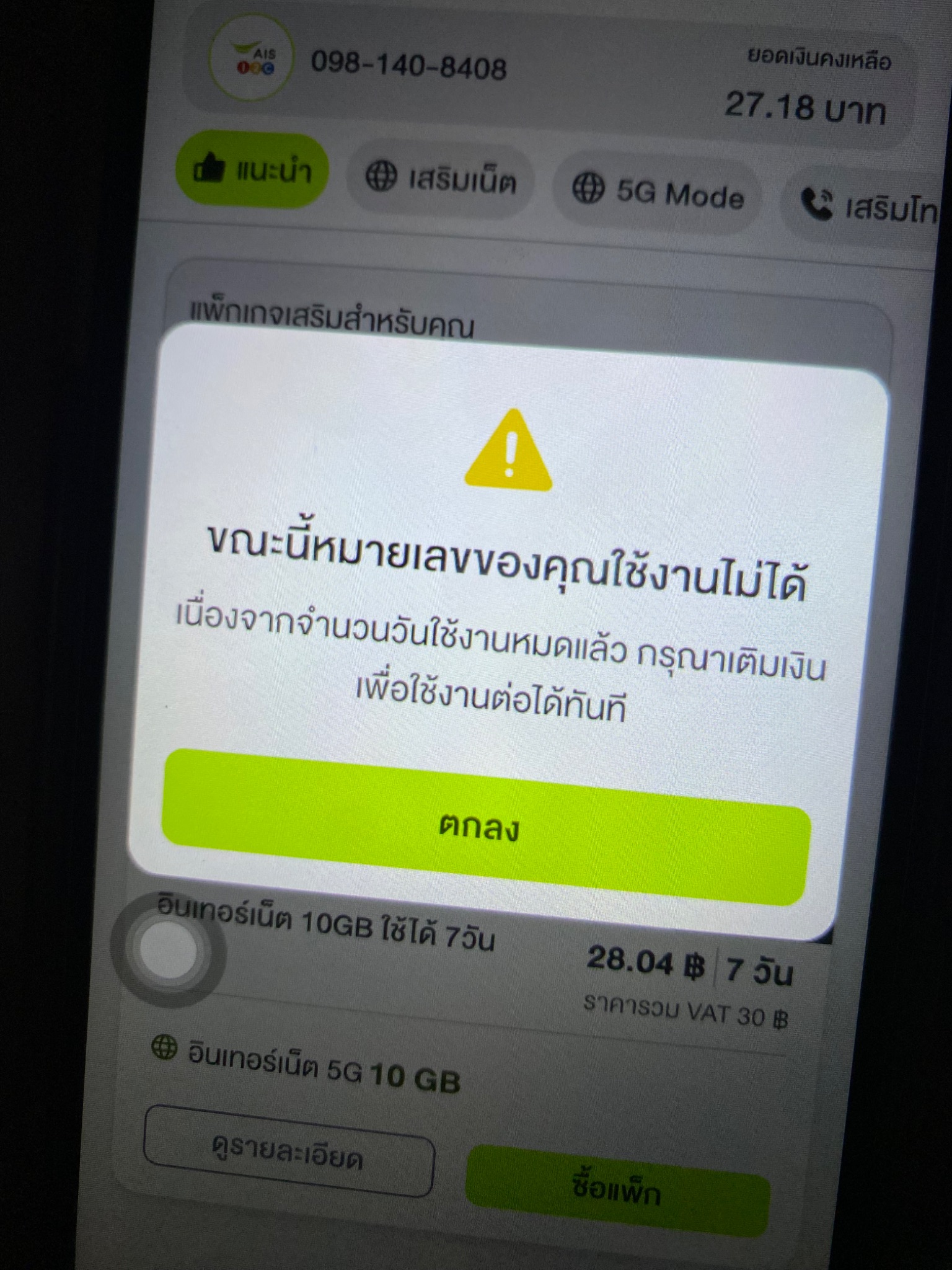 คือ มีข้อความแจ้งมาว่าวันใช่งานใกล้จะหมด ให้เติมเงินเข้า พอเติมเงินเข้าก็ยังใช้งานไม่ได้อยู่ดี?