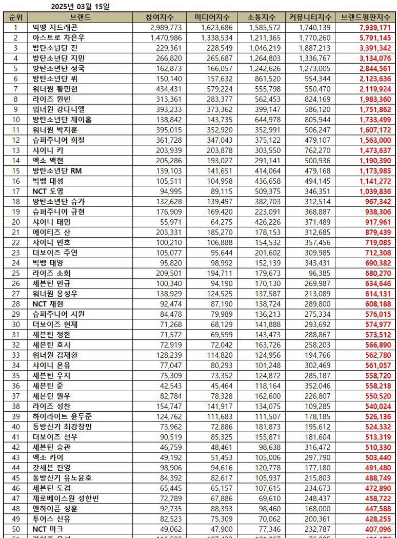 จี-ดราก้อน จากวง BIGBANG อยู่ในอันดับที่สาม ด้วยดัชนีชื่อเสียงแบรนด์ 2,632,471 ในขณะที่จิน จากวง BTS อยู่ในอันดับที่สี่ด้วยคะแนน 2,358,914