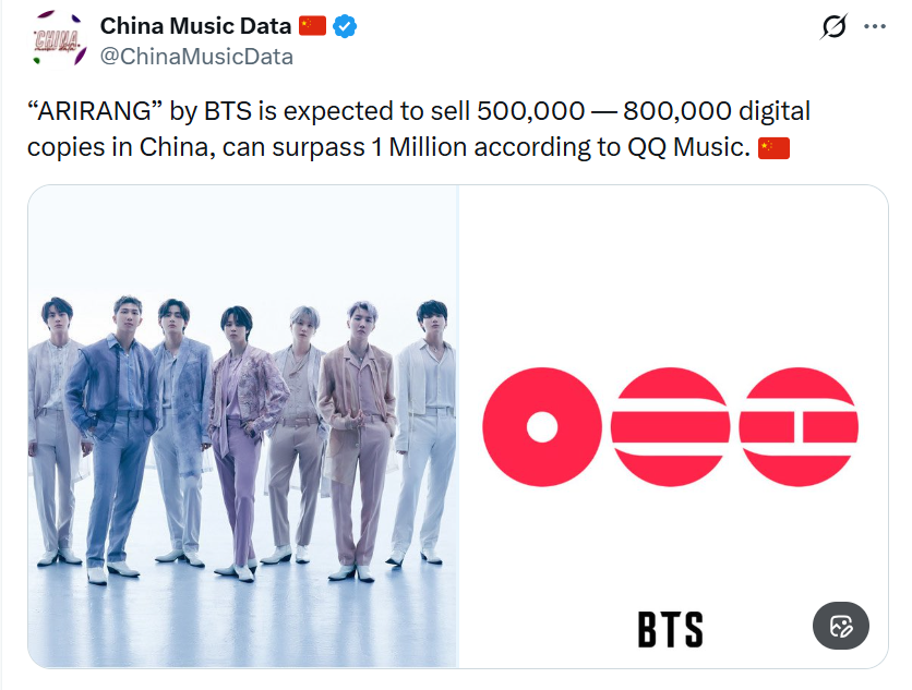 “ARIRANG” ของ BTS คาดการณ์ว่า จะมียอดขายดิจิทัลในประเทศจีนประมาณ 500,000 - 800,000 ชุด และอาจทะลุ 1 ล้านชุด