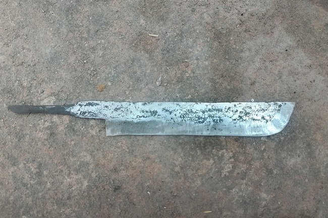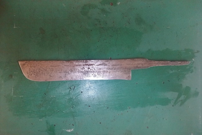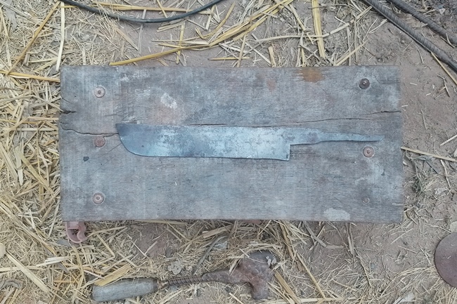 วันแรกผมตีเหยียดตลับลูกปืนทั้ง 2 พวกออกเป็นแผ่น วันที่ 2 นำแผ่นเหล็ก 2 ชิ้นไปเชื่อมไฟฟ้าแล้วนำมาเผาตีอัดให้เชื่อมติดกัน วันที่ 3 ตีเก็บงานให้เรียบแล้วปาดเจียรเป็นใบมีดตามรูปนี้ ผมใช้เวลาตอนเช้าประมาณวันละ 1 ชั่วโมง 3 วันครับ