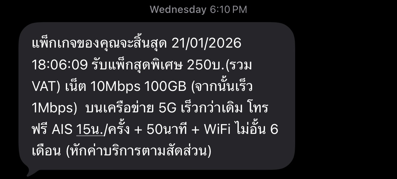 ผมเคยใช้แพคเกจอินเตอร์เน็ต200บาทความเร็ว10Mbps.ไม่จำกัด ของaisมาหลายปีมากจนกระทั้งเข้าปีใหม่ก็มีการส่งข้อความหยุดใช้บริการแพคนี้ครับแล้วผมชอบแชร์เน็ตไปที่คอมเพื่อเล่นเกมซึ่งต้องใช้ความเร็วและไม่จำกัดพ