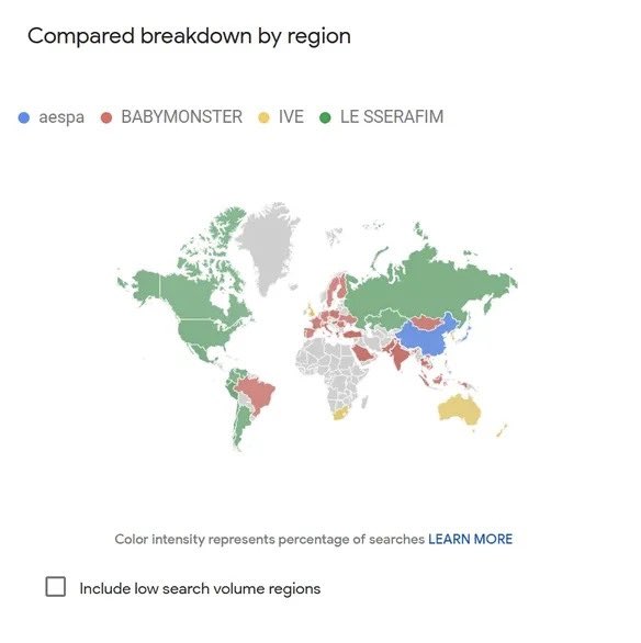 1. BABYMONSTER จะเห็นได้ว่าครองตลาดส่วนใหญ่ทั้งในเอเชียและยุโรป รวมถึงประเทศบราซิลและประเทศแถบตะวันออกกลาง ดูในแผนภูมิ
