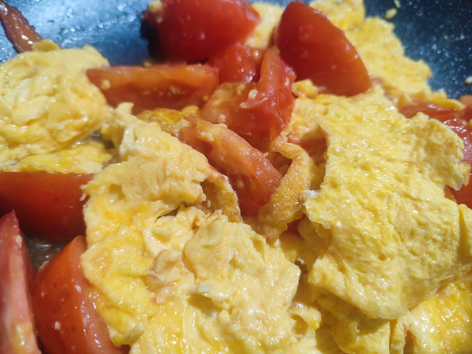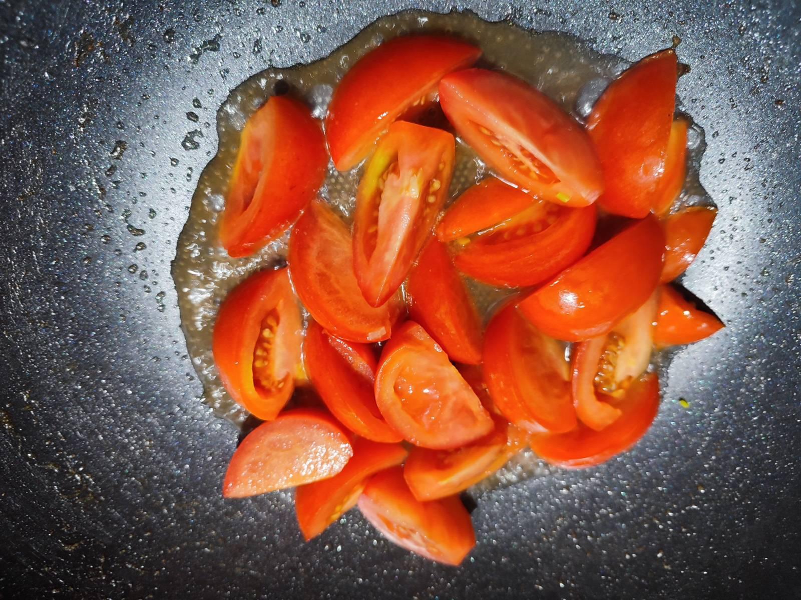 ตักใส่จานพักไว้ เอามะเขือเทศที่หมักน้ำผึ้ง เหล้าสาเก ผัดในกระทะ