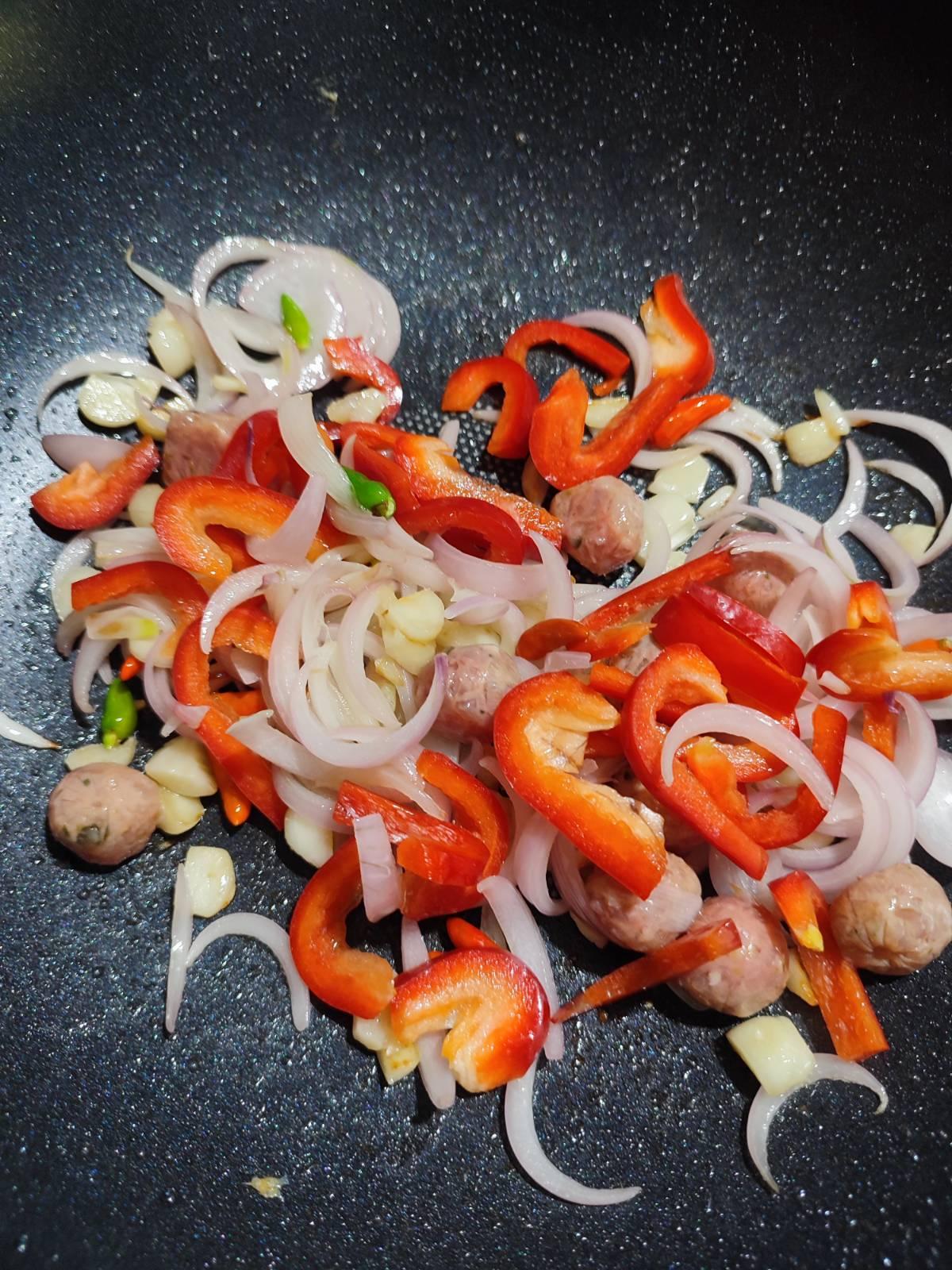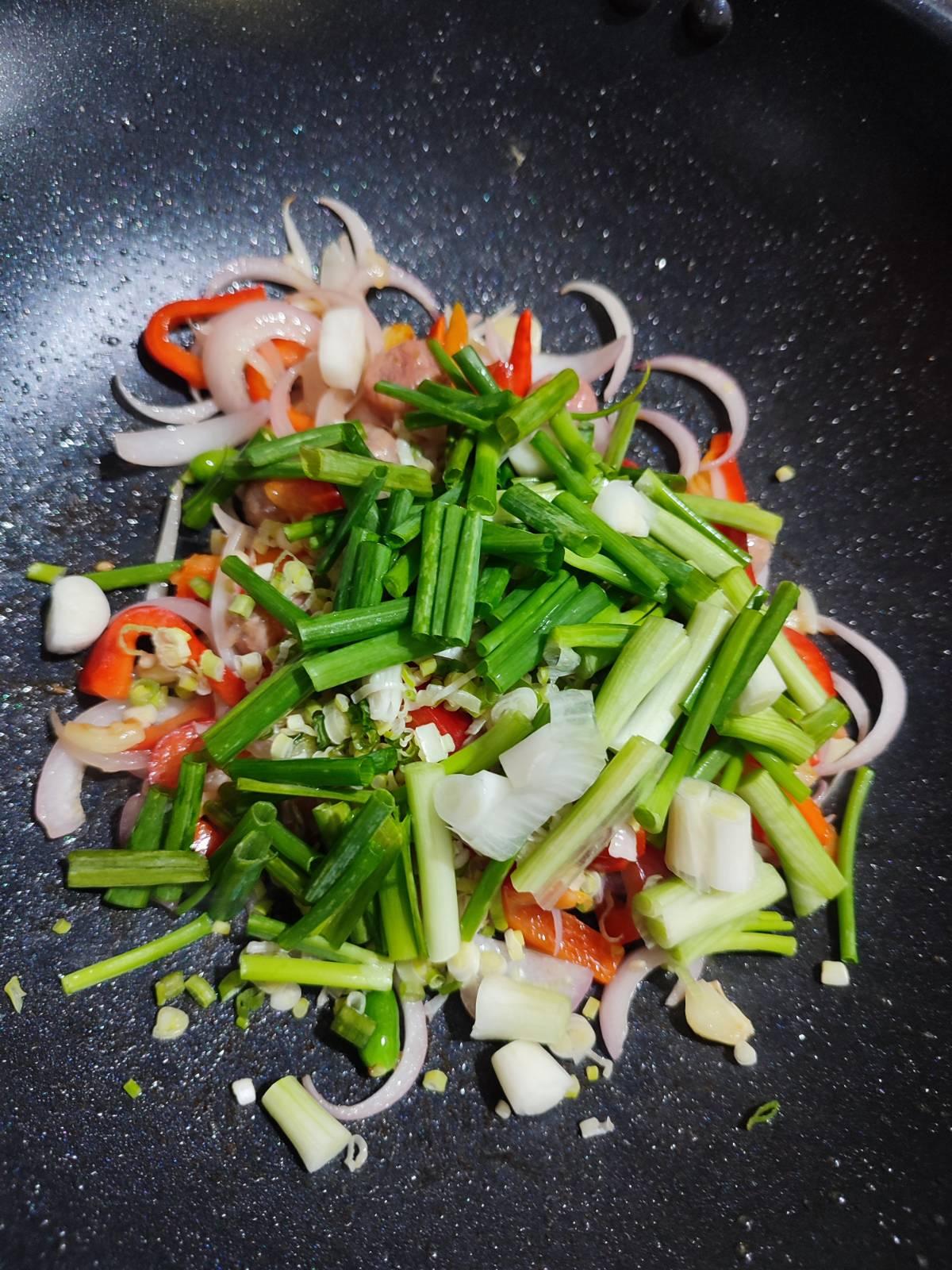 ใส่พริกหวาน ต้นหอมปรุงรสน้ำปลา