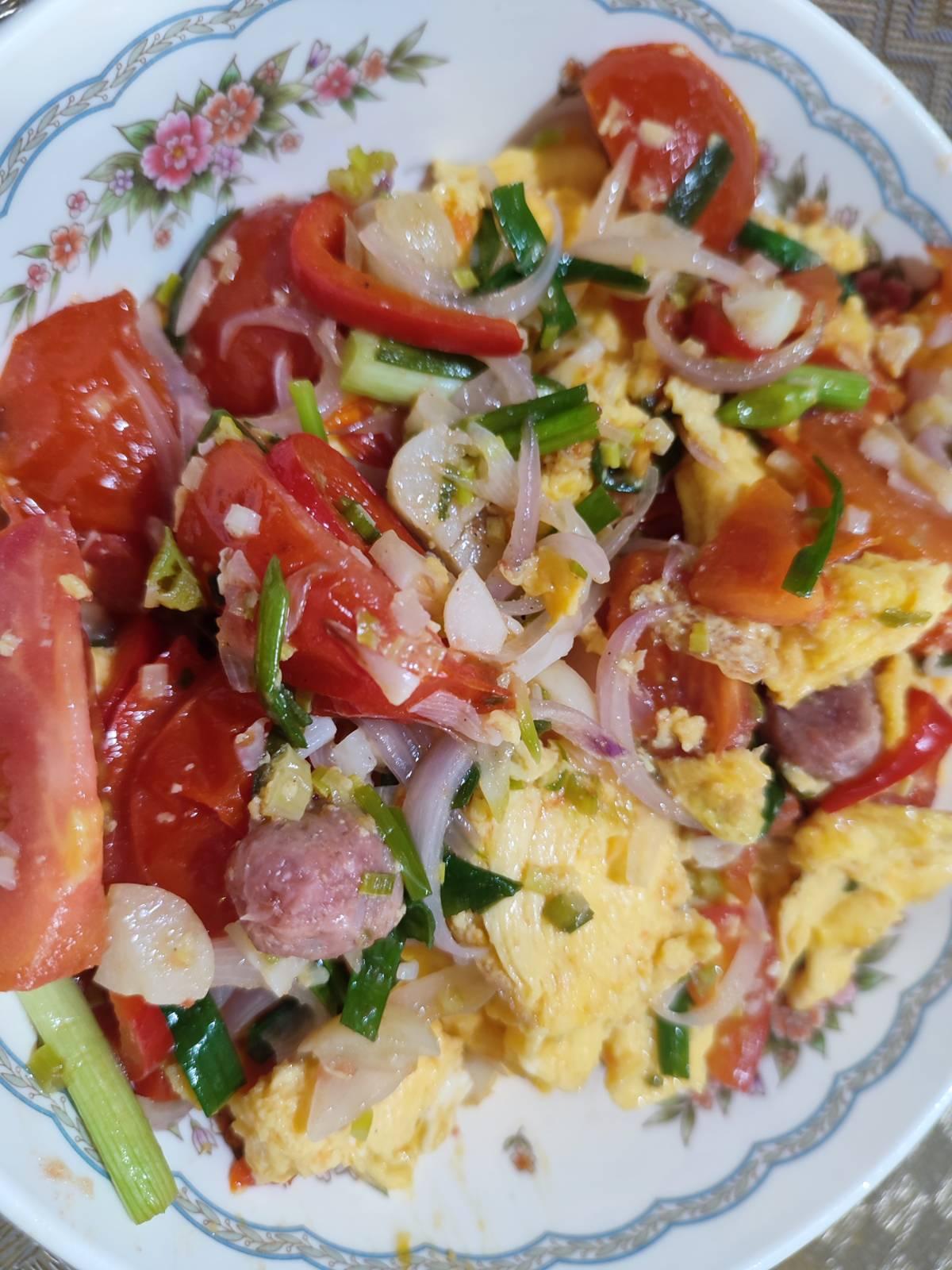 ของกินชลบุรี: ข้าวไข่คั่วแหนม ร้านบ้านเติมสุข ใส่น้ำมันนิดหน่อย ใส่กระเทียม ใส่ไข่ไก่ไป 2 ใบ คั่วไข่แดงให้พอเป็นชิ้น ใส่หอมหัวใหญ่ พริกเขียว ต้นหอม แหนมแท่งเล็กบิลงไปพอเป็นชิ้น ผัดให้พอสุก ตักรา