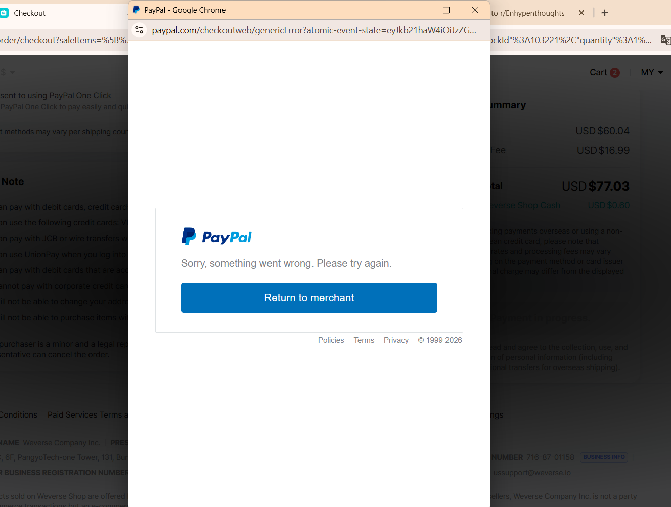 I'm just going to buy The Sin Vanish Album on Weverse, perfectly completed all required information of mine, and when it comes to check out page, I clicked Accept and Pay by PayPal and trying to fill out my email for logging in, but it kept returning to the page says "something went wrong, returning to merchant" like what???????