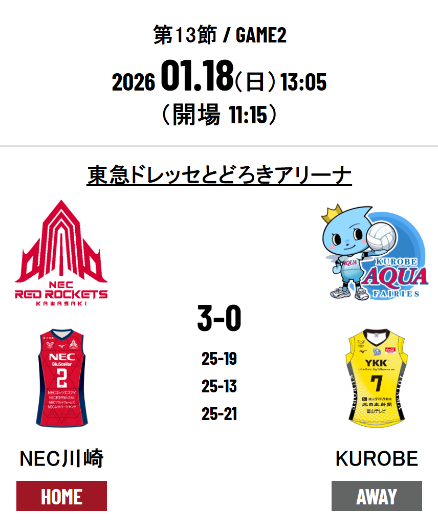 NEC Red Rockets Kawasaki 3 - 0 KUROBE Aqua Fairies