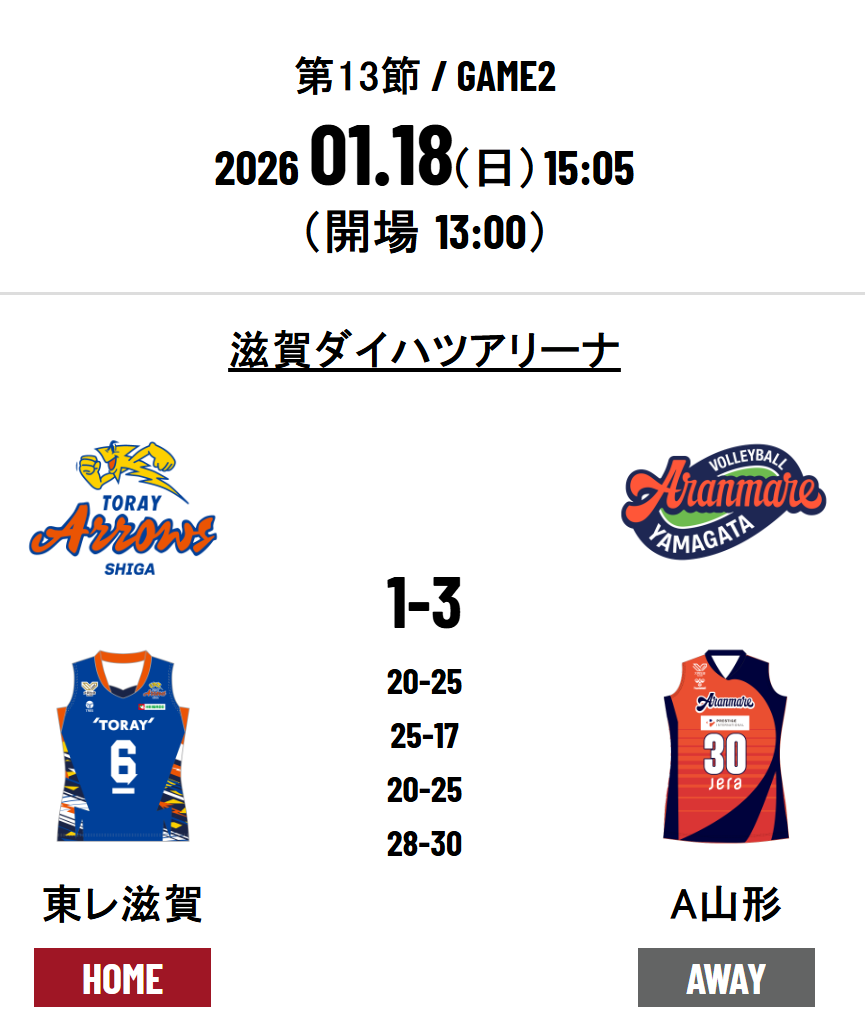 Toray Arrows Shiga 1 - 3 Aranmare Yamagata