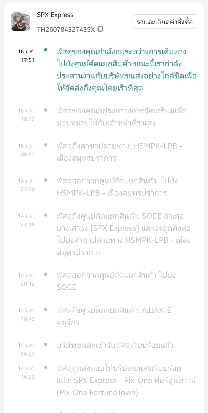 เรื่องมีอยู่ว่า ผมสั่งเคสมือถือไปสองชิ้น ร้านเดิมที่เคยสั่งปกติ แต่ตอนนั้นคิดว่าถ้าส่ง spx คงไม่ติดปัญหาอะไร แต่พอมาวันนี้เป็นวันกำหนดส่งสินค้า แต่สถานะยังไม่ขยับจากเดิมเลยครับ ปกติใช้เจ้านี้ไม่มีปัญห