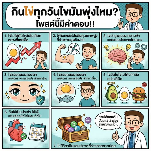 สรุปคือ ไข่ไม่ใช่อาหารที่ควรถูกกลัว แต่เป็นอาหารพื้นฐานที่ร่างกายออกแบบมาให้ใช้ได้ดี ปัญหาไม่ได้อยู่ที่ “กินไข่” แต่อยู่ที่ “กินไข่คู่กับอะไร” ถ้ากินไข่ต้ม ไข่นึ่ง ไข่ตุ๋น คู่ผักและอาหารจริง ไข่จะช่วยซ่อมร่างกายมากกว่าทำร้าย แต่ถ้ากินคู่ของทอด น้ำหวาน และอาหารแปรรูป แบบนั้นต่อให้ไม่กินไข่ ไขมันก็พังอยู่ดีครับ เริ่มแก้ความเข้าใจเรื่องไข่ใหม่ สุขภาพจะเบาขึ้นกว่าที่คิดครับ