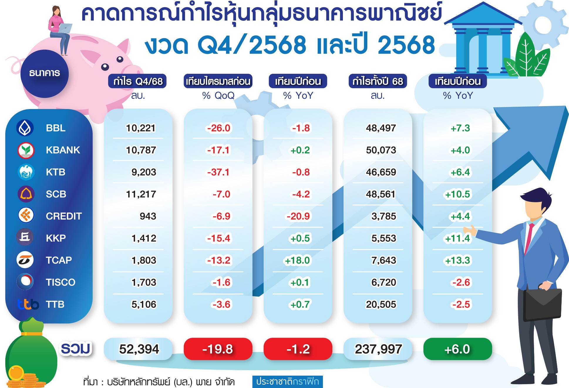 นายธนเดช รังษีธนานนท์ ผู้บริหารสูงสุด ฝ่ายวิเคราะห์หลักทรัพย์ บริษัทหลักทรัพย์ พาย จำกัด (มหาชน) เปิดเผยว่า คาดการณ์ผลประกอบการกลุ่มธนาคาร ในไตรมาส 4/2568 ที่กำลังจะประกาศ มีแนวโน้มอ่อนตัว โดยคาดว่าธนาคารพาณิชย์ 9 แห่งจะรายงานกำไรสุทธิรวมอยู่ที่ประมาณ 52,400 ล้านบาท ลดลง 1% ต่อปี (YOY) และลดลง 20% เมื่อเทียบกับไตรมาสก่อนหน้า (QOQ)