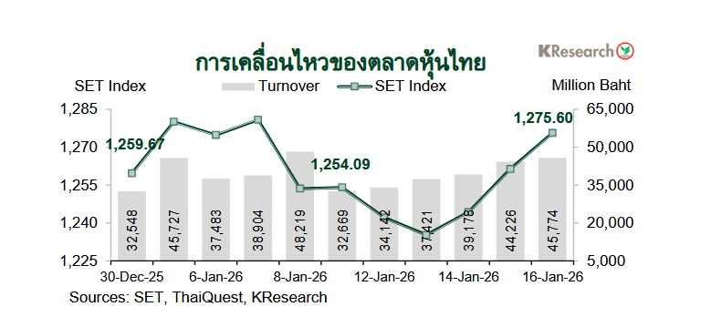สำหรับสัปดาห์(19-23 ม.ค. 69) บริษัทหลักทรัพย์กสิกรไทย จำกัด มองว่า ดัชนีหุ้นไทยมีแนวรับที่ 1,260 และ 1,250 จุด ขณะที่แนวต้านอยู่ที่ 1,285 และ 1,300 จุด ตามลำดับ โดยศูนย์วิจัยกสิกรไทยประเมินปัจจัยสำคัญที่ต้องติดตาม ได้แก่ ผลประกอบการไตรมาส 4/2568 ของบจ.ไทย และทิศทางเงินทุนต่างชาติ ส่วนข้อมูลเศรษฐกิจสหรัฐฯ ที่สำคัญ ได้แก่ ดัชนี PMI ภาคการผลิตและการบริการเดือนม.ค. (เบื้องต้น) รายได้และรายจ่ายส่วนบุคคลเดือนต.ค. – พ.ย. ตัวเลขจีดีพีไตรมาส 3/2568 รวมถึงจำนวนผู้ขอรับสวัสดิการว่างงานรายสัปดาห์