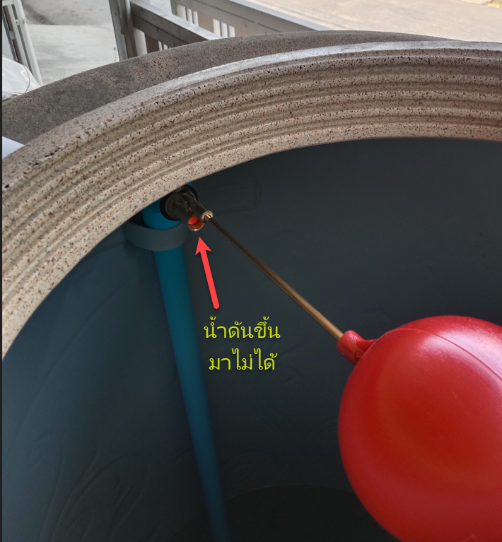 1. ต่อฝั่งขาเข้าแล้วน้ำไม่ไหล วาล์วลูกลอย เหลือแต่ท่อปล่าวๆ ก็ไม่ไหลขึ้นมาถึง