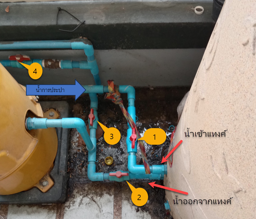 เปิด วาวล์ 1 2 คราวน้ำน้ำประปาจะไหลเข้าแทงค์ผ่านท่อขาออกมันก็ไหลเอื่อยๆ เข้าแทงค์เรื่อย