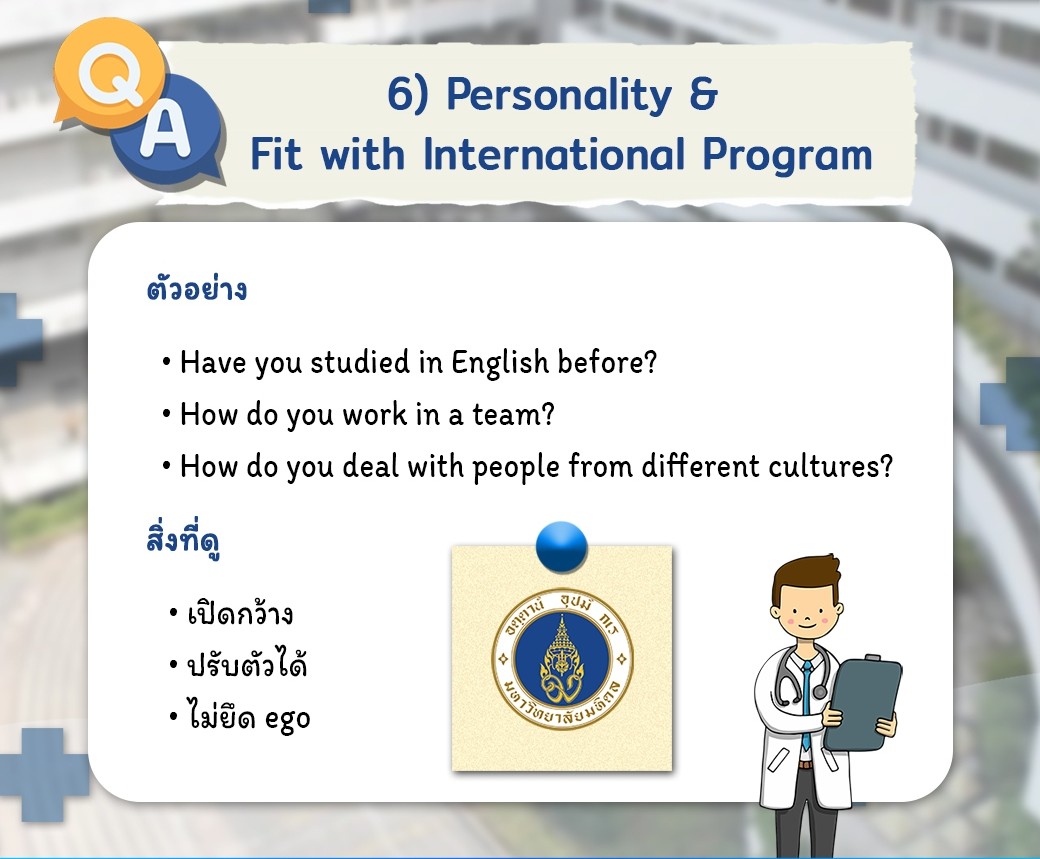 6. Personality & Fit (เข้ากับหลักสูตรได้ไหม) เนื่องจากเป็นหลักสูตรนานาชาติ เขาจะดูว่าคุณพร้อมทำงานกับคนที่แตกต่างหลากหลายวัฒนธรรมได้ไหม "How do you deal with people from different cultures?" เน้นความเปิดกว้าง ปรับตัวเก่ง และไม่มี Ego
