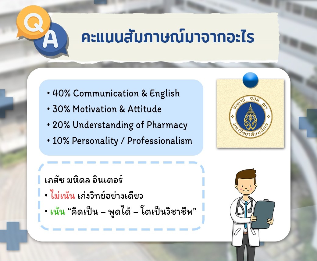 เภสัชมหิดล อินเตอร์ เน้นคนที่มี "คิดเป็น - พูดได้ - โตเป็นวิชาชีพ" ใครที่กำลังเตรียมตัวอยู่ อย่าเพิ่งท้อครับ ฝึกซ้อมตอบคำถามบ่อยๆ ให้ดูเป็นธรรมชาติที่สุด แล้วเจอกันที่คณะนะครับ!