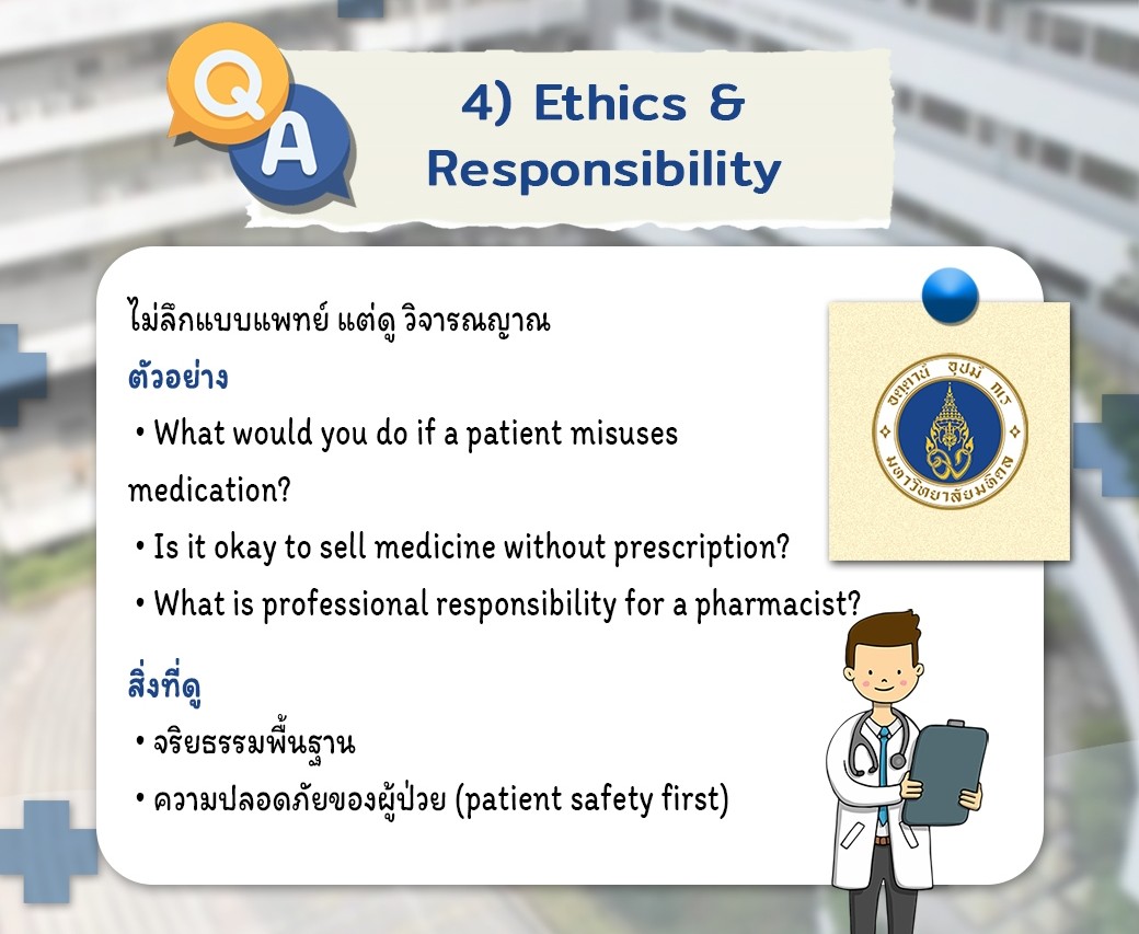 4. Ethics & Responsibility (จริยธรรม) คำถามแนวจำลองสถานการณ์ เช่น "Is it okay to sell medicine without prescription?" หัวใจสำคัญคือต้องยึดหลัก "Patient Safety First" (ความปลอดภัยของผู้ป่วยต้องมาก่อนเสมอ)