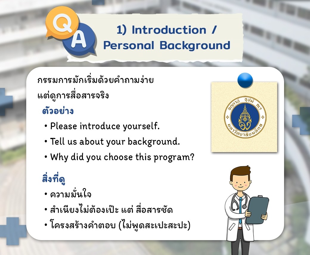 1. Introduction / Personal Background เริ่มจากคำถามง่ายๆ เช่น "Please introduce yourself" หรือ "Why did you choose this program?" สิ่งที่กรรมการดูคือความมั่นใจ โครงสร้างคำตอบที่เป็นระบบ และการสื่อสารที่ชัดเจน (สำเนียงไม่ต้องเป๊ะ แต่ต้องเข้าใจ!)