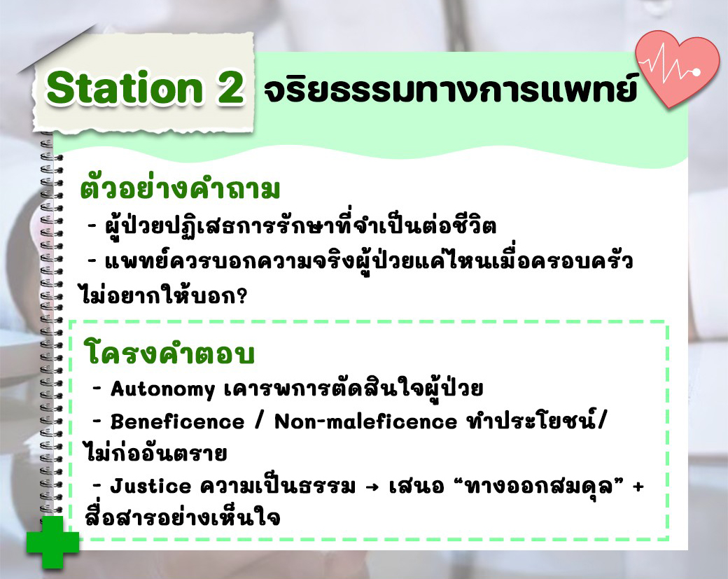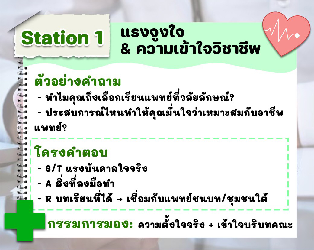• Station 1 แรงจูงใจในการเรียนแพทย์ และความเข้าใจในวิชาชีพ