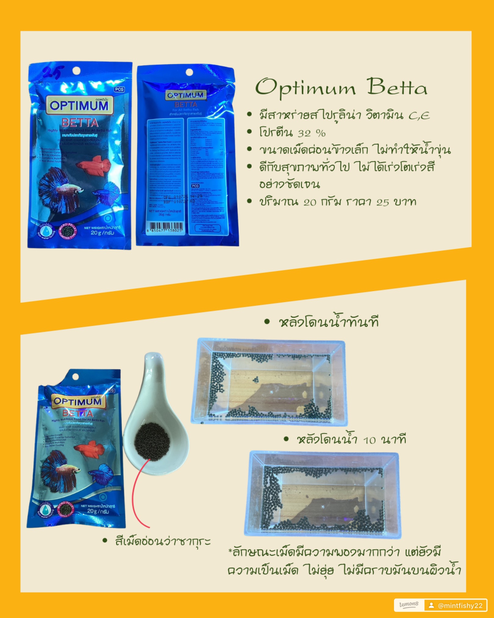 ต่อมาเป็น Optimum betta อาหารปลากัดซองสีน้ำเงินสะดุดตา โปรตีน32% ส่วนผสมของสาหร่ายสไปรูลิน่า วิตามินซีและอี ให้น้องปลากินได้ทุกวันและช่วยบำรุงสุขภาพ ไม่ได้เร่งโตเร่งสีขั้นสุด กินได้ทุกช่วงวัยและเหมะกับปลาอายุมาก หาซื้อง่าย ราคาไม่แพง เลี้ยงน้องปลาพันธุ์ไหนก็เอาอยู่