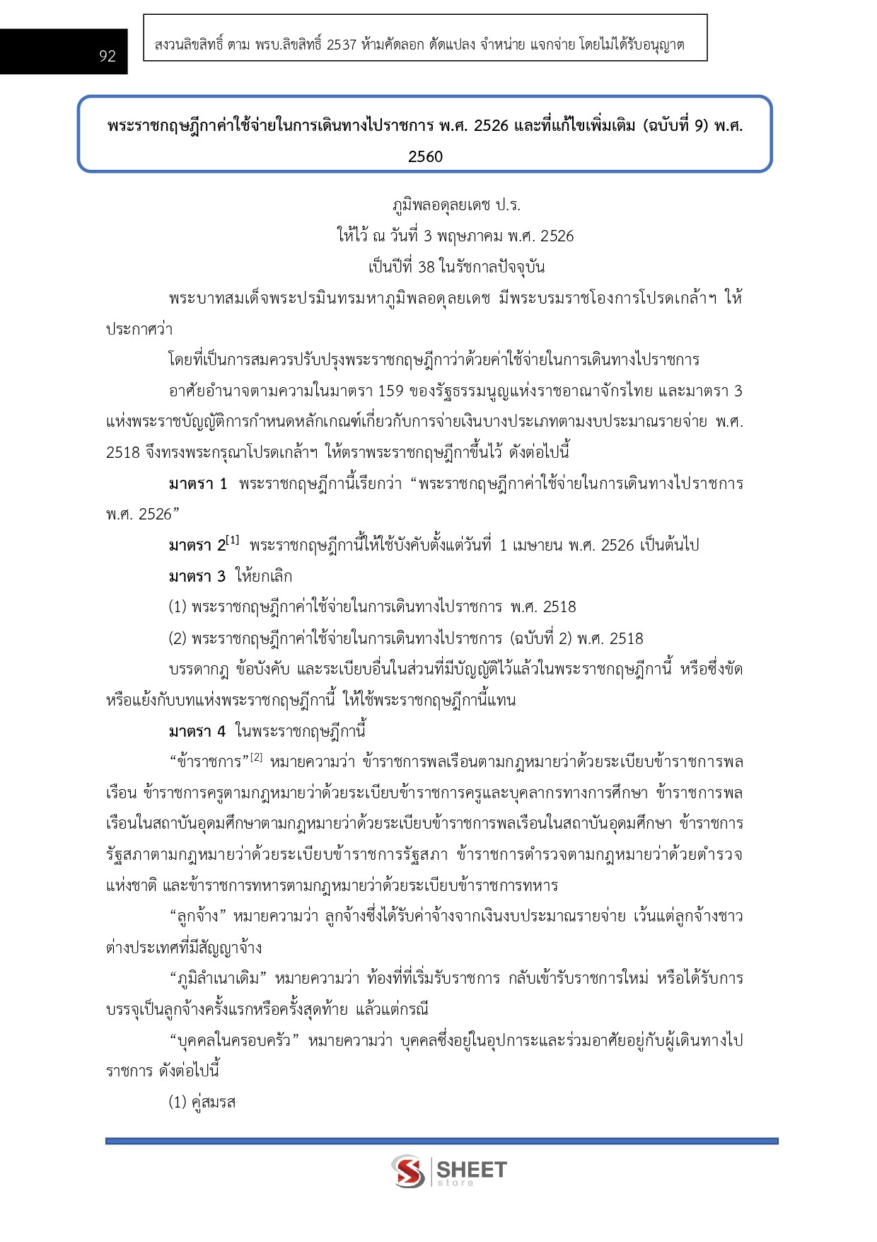 – พระราชกฤษฎีกาค่าใช้จ่ายในการเดินทางไปราชการ พ.ศ. 2526 และแก้ไขเพิ่มเติม (ฉบับที่ 9) พ.ศ. 2560