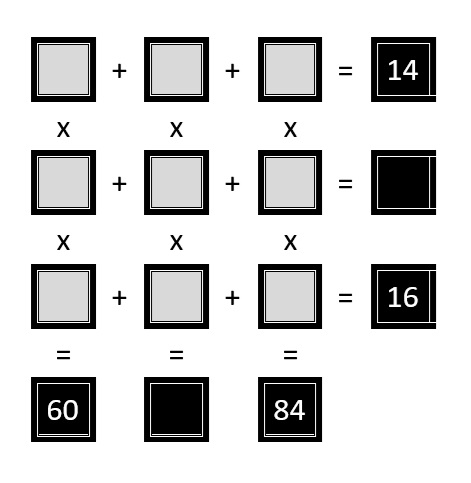 ให้ใส่ตัวเลข 1-9 อย่างละตัว ลงในช่องสีเทา แล้วให้ผลบวกของแต่ละแถว เท่ากับช่องสีดำขวามือสุด