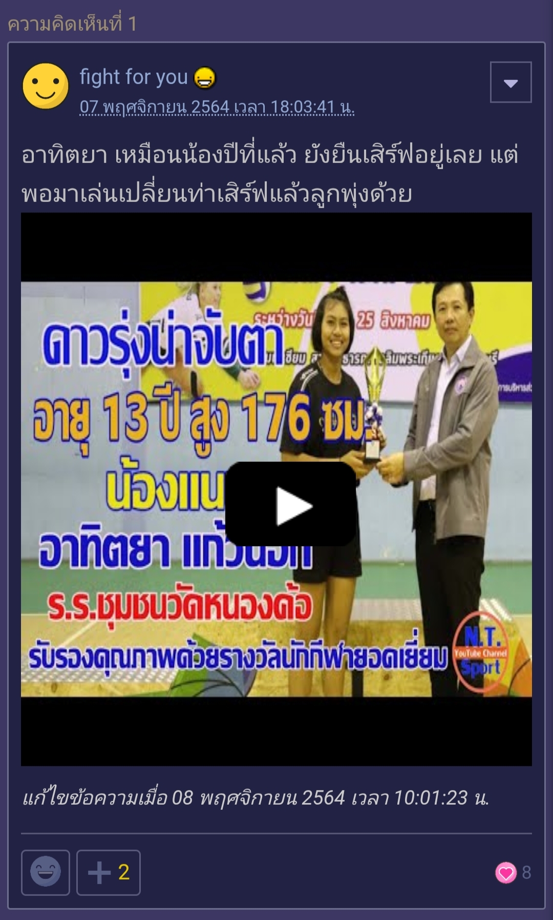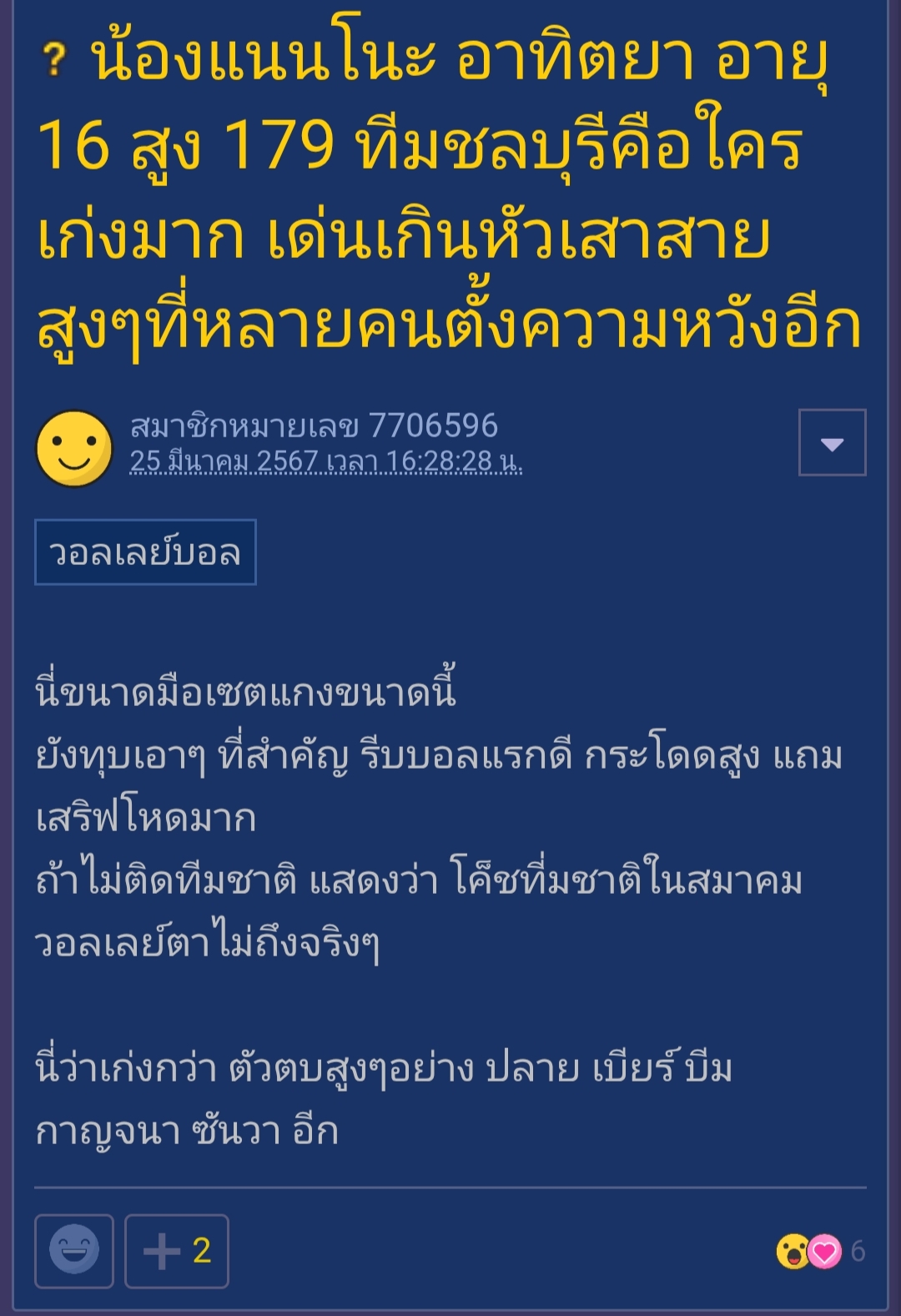 ตอนแรกพันทิปคาดหวังไว้มากโดยเฉพาะเรื่องการเสริฟพส.พันทิปว้าวมากๆถึงขนาดอยากให้ทีมชาติชุดใหญ่มาดูงาน เล่นไปเล่นมากลายเป็นอ่อมโดยเฉพาะบอลแรก จนหลุดทีมชาติชุดเด็ก แล้วอยู่ดีๆปีนี้นางก็ฟื้นเฉยกับสโมสรผลงานก็ดี ล่าสุดกับกีฬามหาวิทยาลัยนางก็ดูดีวันดีคืน ทุกคนคิดว่านางยังอยู่ในเส้นทางโรดทูทีมชาติไทยอยู่มั้ยคะ