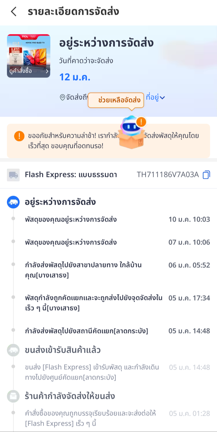 ลำดับเหตุการณ์มีดังนี้ครับ วันที่ 5 มกราคม 2569 เวลา 10:35 น. พัสดุถูกส่งออกกับ Flash Express หมายเลขพัสดุ: th711186xpXXXX การจัดส่งในช่วงแรกดูเป็นปกติ จนกระทั่งวันที่ 7 มกราคม 2569 มีการอัปเดตสถานะคร
