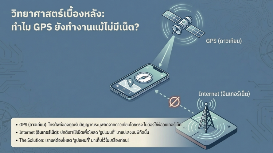 นี่คือความจริงพื้นฐานที่น่าประหลาดใจที่สุด: GPS และอินเทอร์เน็ตเป็นเทคโนโลยีที่แยกจากกันโดยสิ้นเชิง! ความจริงแล้ว โทรศัพท์มือถือของคุณมีชิป GPS ในตัวที่ทำหน้าที่สื่อสารกับดาวเทียมที่โคจรอยู่รอบโลกโดยตรงเพื่อระบุตำแหน่งของคุณ (เจ้าจุดสีน้ำเงินบนแผนที่นั่นเอง) และกระบวนการนี้ ไม่จำเป็นต้องใช้อินเทอร์เน็ตเลยแม้แต่น้อย