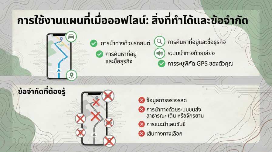 แม้ว่าแผนที่ออฟไลน์จะมีประโยชน์มาก แต่ก็มีข้อจำกัดที่สำคัญและไม่สามารถทำงานได้เต็มรูปแบบเหมือนเวอร์ชันออนไลน์ โดยฟีเจอร์หลักๆ ที่จะ ไม่สามารถใช้งานได้ ในโหมดออฟไลน์ ได้แก่: