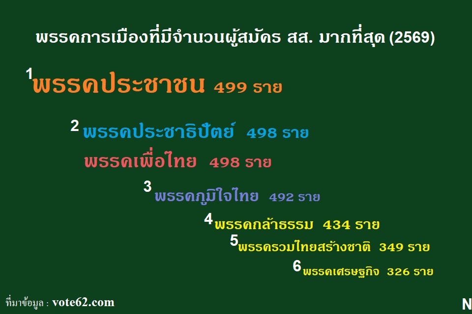 เทศกาลหาเสียงเลือกตั้งใหญ่ ปี 2569 กำลังคึกคักและเข้มข้นทุกขณะ พรรคการเมืองทั้งรายใหญ่รายเล็กส่งผู้สมัคร สส. ทั้งแบบแบ่งเขตและบัญชีรายชื่อเป็นจำนวนมากมาย แม้ว่าครั้งนี้ยังไม่มีพรรคใดได้รายชื่อครบ 500 คนถ้วน (แบ่งเขต 400 คน และบัญชีรายชื่อ 100 คน) แต่ประชาชนอย่างเรา ๆ ก็อยากจะรู้นักว่าพรรคใดเอ่ยที่ส่งเข้าไปชิงตำแหน่งมากที่สุด?