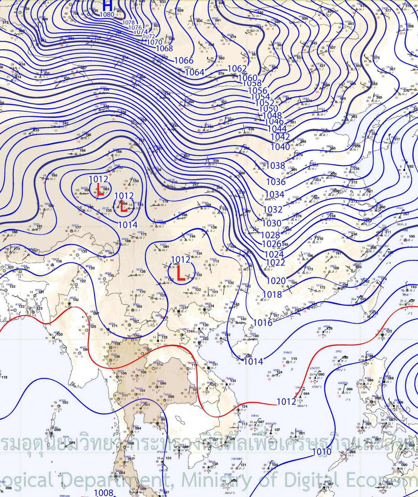 อันนี้เป็นภาพแผนที่อากาศเวลา 7 โมงเช้าวันนี้ครับ ภาพข้างล่างนี้คือผม crop มาจากภาพเต็มในลิงค์แผนที่อากาศกรมอุตุนิยมวิทยา จะเห็นว่าด้านบนสุดความกดอากาศสูงไปถึง 1080 hPa เลยทีเดียว