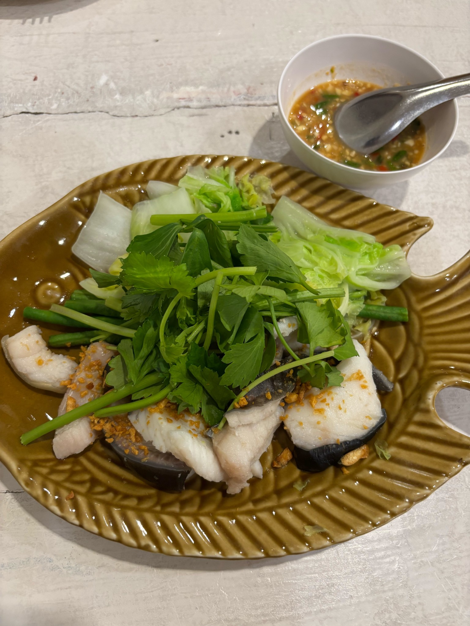 ปลาคังลวกจิ้ม สด เด้ง แถมน้ำจิ้มเป็นแบบเต้าเจี้ยว จัดจ้านและกลมกล่อมทีเดียว