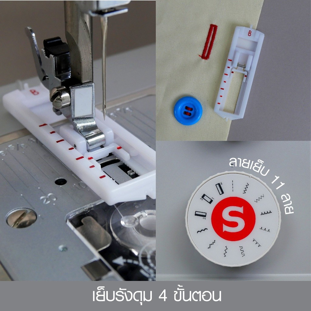 จุดที่ทำให้ใช้งานสะดวกคือรังดุมอัตโนมัติ 4 ขั้นตอน เย็บรังดุมได้เป็นระเบียบสม่ำเสมอ และตัวเครื่องขนาดกะทัดรัดแบบกระเป๋าหิ้ว เคลื่อนย้ายง่าย เหมาะกับพื้นที่จำกัดแต่ยังอยากได้จักรเย็บผ้าที่ครบฟังก์ชัน