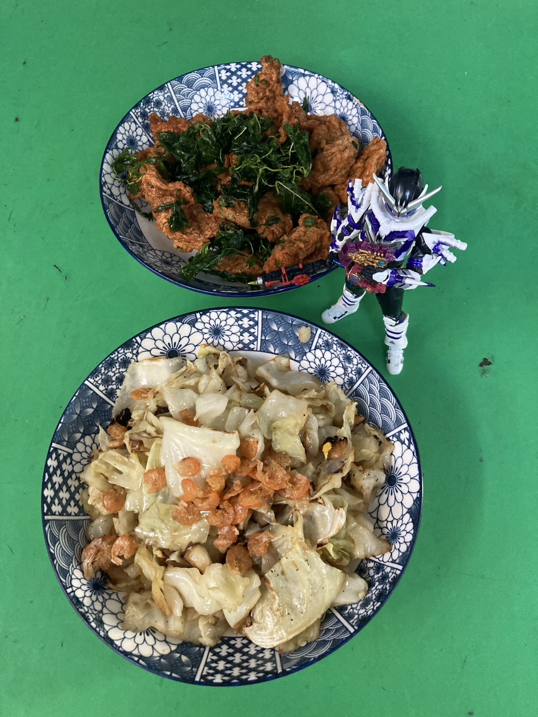 ผัดกะหล่ำปลีไฟแรงไปหน่อย กระเทียมไหม้เลย ทอดกุ้งแห้งโรยหน้าให้น้อง เดี๋ยวจะหาว่ามีแค่นี้เหรอ ชมพู่เอาไว้กินคืนนี้