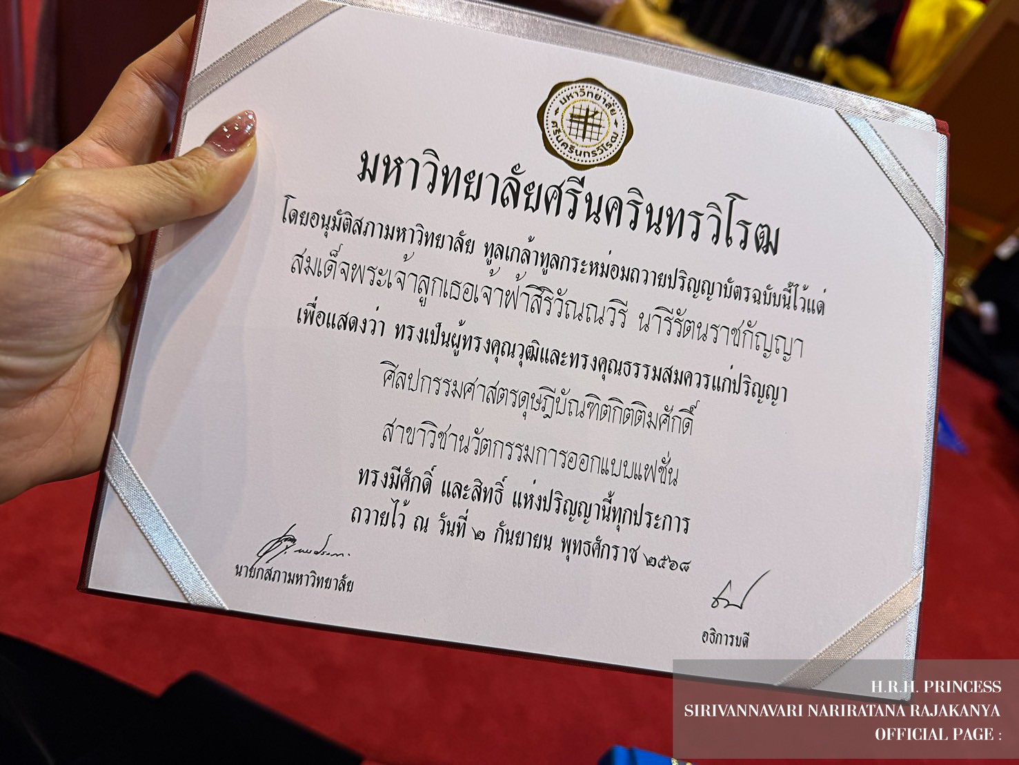 เมื่อวันที่ ๒ กันยายน ๒๕๖๘ จากการประชุมครั้งที่ ๑๐/๒๕๖๘ ของสภามหาวิทยาลัยศรีนครินทรวิโรฒ ซึ่งมีมติเป็นเอกฉันท์ ขอพระราชทานทูลเกล้าทูลกระหม่อม ถวายปริญญาศิลปกรรมศาสตรดุษฎีบัณฑิตกิตติมศักดิ์ สาขาวิชานวัตกรรมการออกแบบแฟชั่น ในการสร้างประโยชน์สุข แก่อาณาราษฎร และประเทศชาติ พระปรีชาสามารถและพระกรณียกิจของพระองค์ ได้สะท้อนถึงปรัชญาของมหาวิทยาลัยศรีนครินทรวิโรฒ ในการรับใช้สังคมอย่างแท้จริง และทรงเป็นดั่ง "เสาหลักของแผ่นดิน" ในด้านการอนุรักษ์และพัฒนางานศิลปหัตถกรรมไทยให้ยั่งยืน