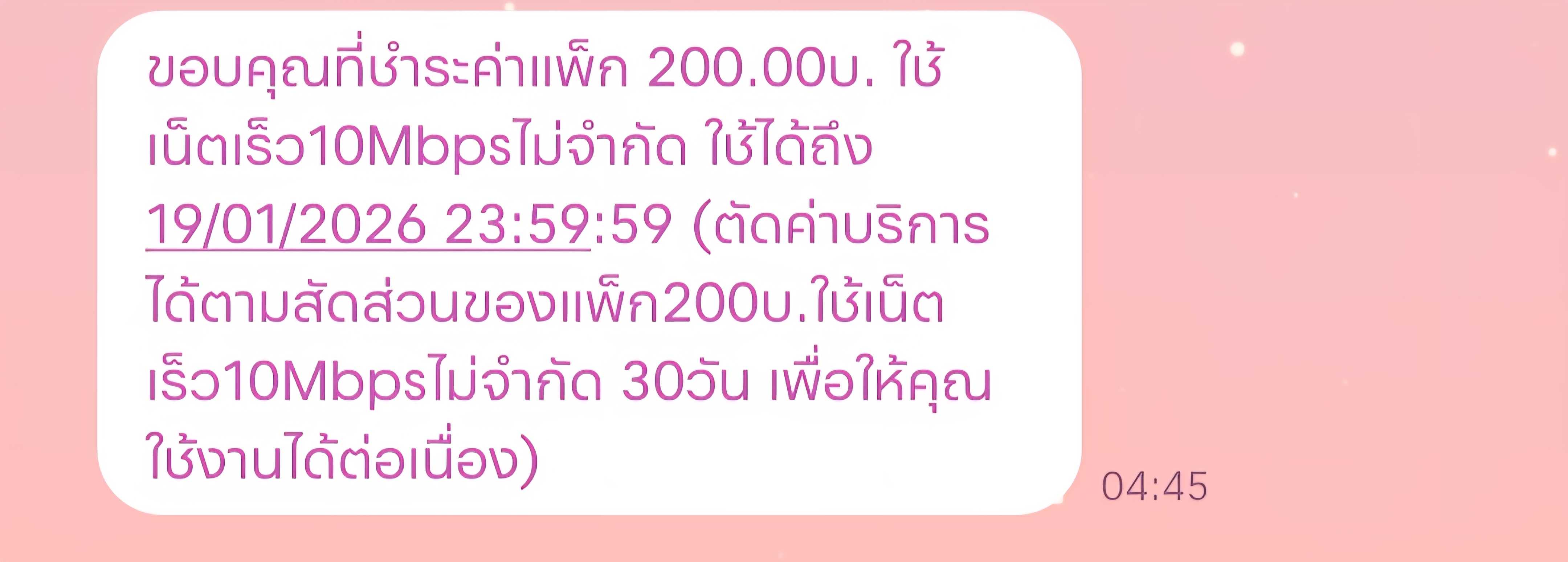 คือตอนนี้ใช้ แพ็ก 200บ. เน็ตไม่จำกัด เร็ว 10Mbps โทรฟรี 30วัน ตอนนี้มีข้ความแจ้งว่า " แนะนำเติมเงินให้เพียงพอสำหรับคิดค่าบริการของ แพ็ก200บ. ใช้เน็ต100GB(เร็ว10Mbps) โทรฟรี 6M ในวันที่