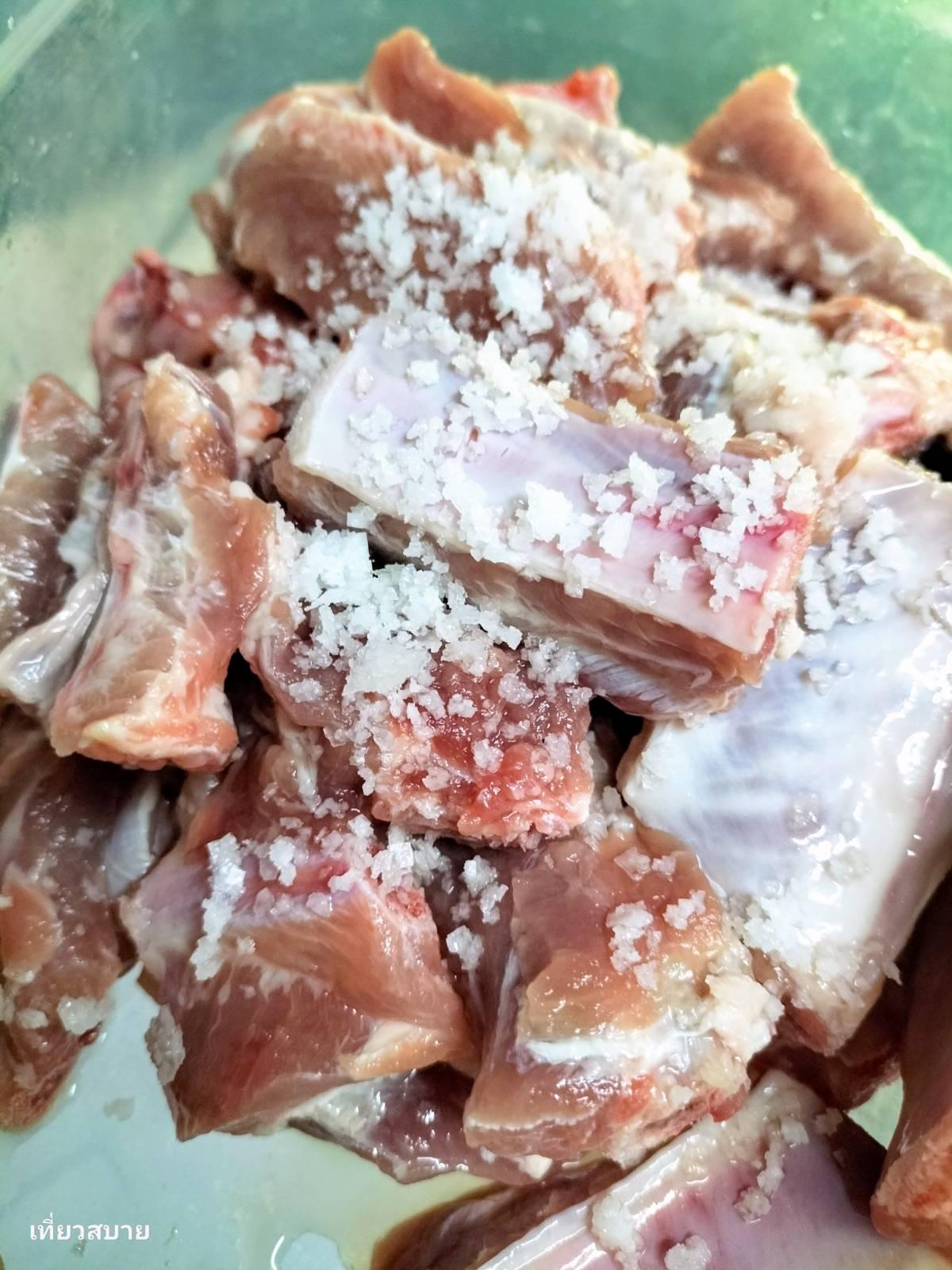 1. ซี่โครงหมู: นำมาคลุกเกลือแล้วล้างน้ำให้สะอาด เพื่อขจัดเลือดและกลิ่นคาว เวลาผัดสีจะสวยน่าทานค่ะ