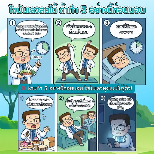 ถ้าอยากให้ไขมันเลวลดจริง อย่ามองแค่อาหารหรือยาอย่างเดียว แต่ให้โฟกัส “ช่วงก่อนนอน” ซึ่งเป็นเวลาทองของการจัดการไขมันในเลือด แค่กินมื้อเย็นให้เบา ขยับตัวเล็กน้อย เข้านอนให้ตรงเวลา และเลี่ยงพฤติกรรมที่ไปรบกวนตับตอนกลางคืน ไขมันเลวมีโอกาสค่อย ๆ ลงได้อย่างปลอดภัย โดยไม่ต้องเพิ่มยาเลยครับ