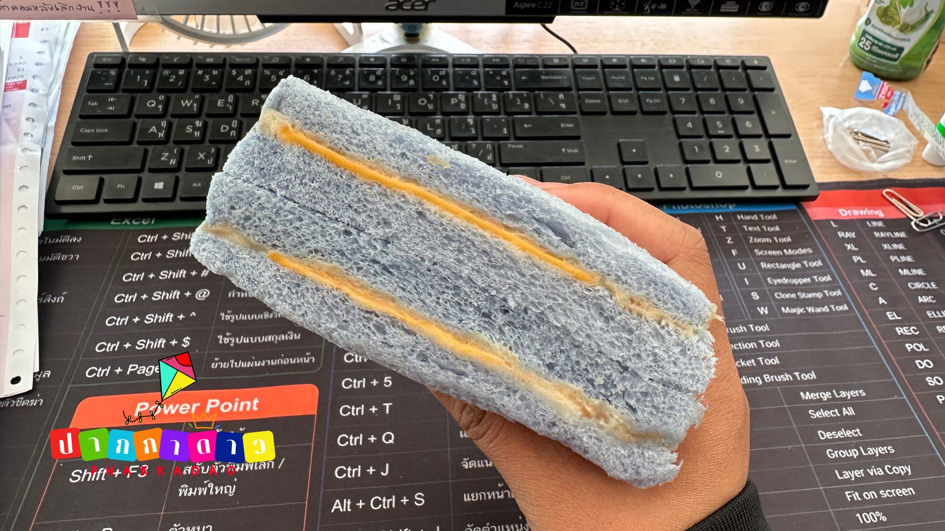 ขนมปังสีฟ้านี้ได้สีมาจาก อัญชัน ทำให้หน้าตาดูแตกต่างจากแซนวิชทั่วไปในตู้เย็นเซเว่น
