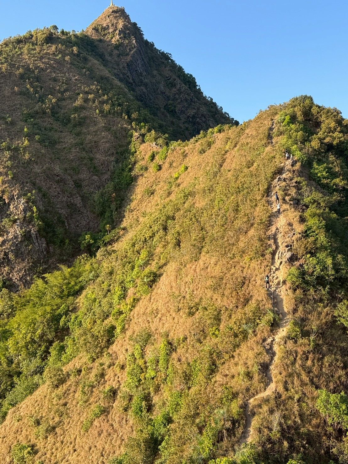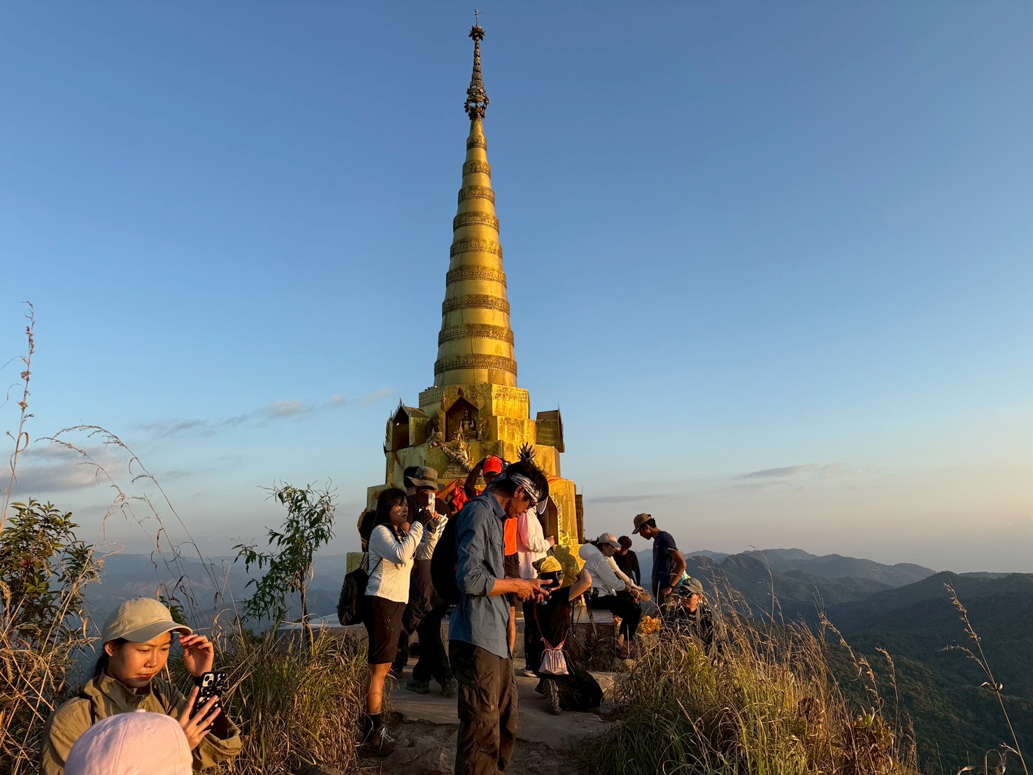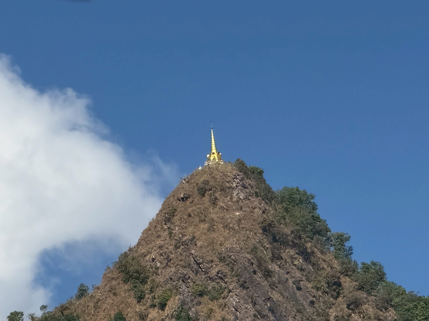 แต่ไฮไลท์ของ เลอกอเดาะ อยู่ที่พระธาตุสีทองบนยอดเขาที่ไกลลิบๆ และสูงชัน ทางขึ้นไป ชันแคบ และ หลายจุดเป็นสันดาบกวา้งราวๆ ฟุตกว่าๆ สองข้างเป็นเหว มีเชือกให้จับเดิน ผ่าน