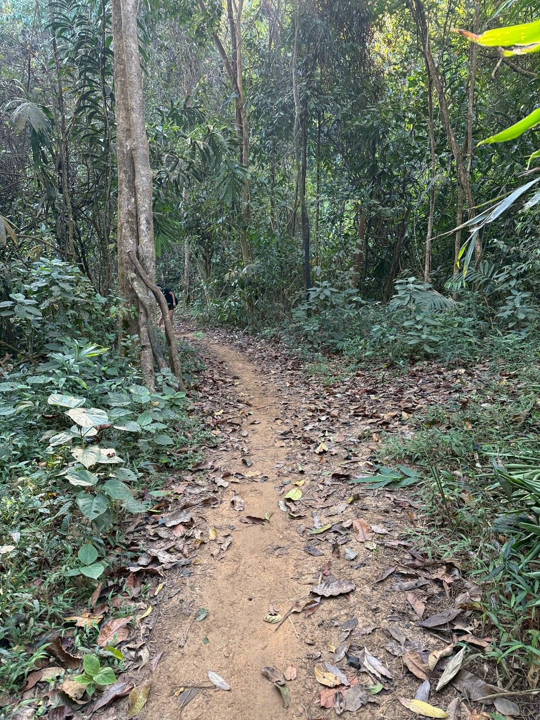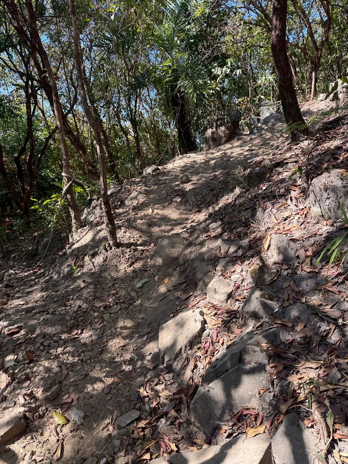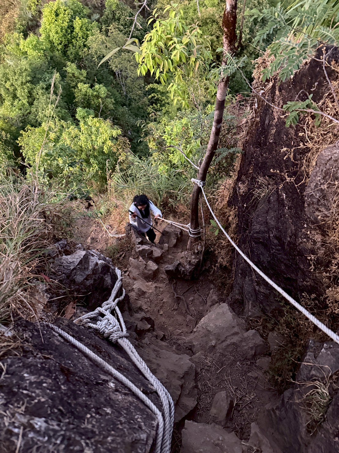 เส้นทางช่วงแรกผ่านลำธาร และ ป่าเขาทางค่อนข้างชัน หลายช่วงชาวบ้านเค้าทำขั้นบันไดปูนง่ายให้เดิน แต่หลายช่วงต้องไต่หิน และ ดึงเชือก Fix Rope ช่วย ไตขึ้น (ถ้าไปที่นี่นอกจาก Treking Pole แล้ว ถุงมือควรมีไปด้วย)
